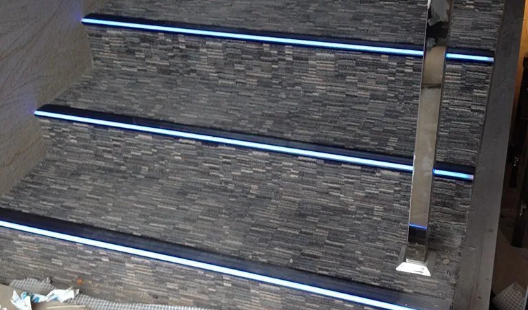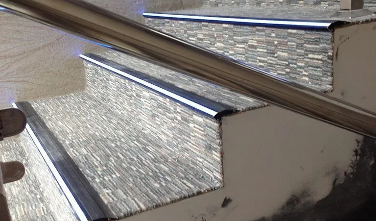 А если ступень не выпирает и представляет собой простой угол, то на помощь приходит специальный алюминиевый профиль для подсветки ступеней лестницы. Профиль монтируется накладным способом на угол ступени. Внутрь него устанавливается открытая светодиодная лента, паз, в котором она установлена, затем закрывается специальной вставкой. Эта вставка пропускает свет от ленты, создавая эффект световой линии, и одновременно она является противоскользящим элементом.