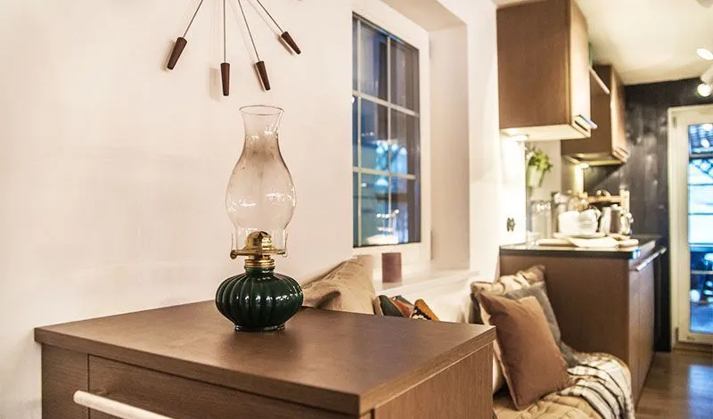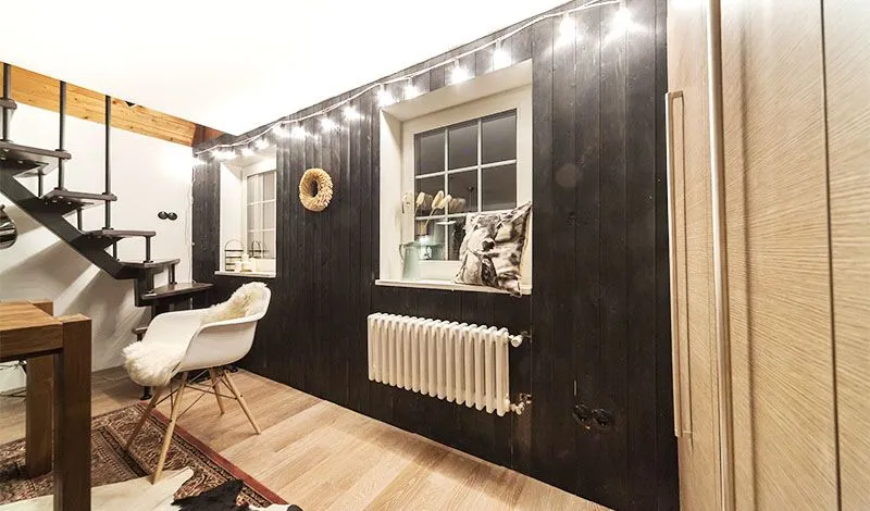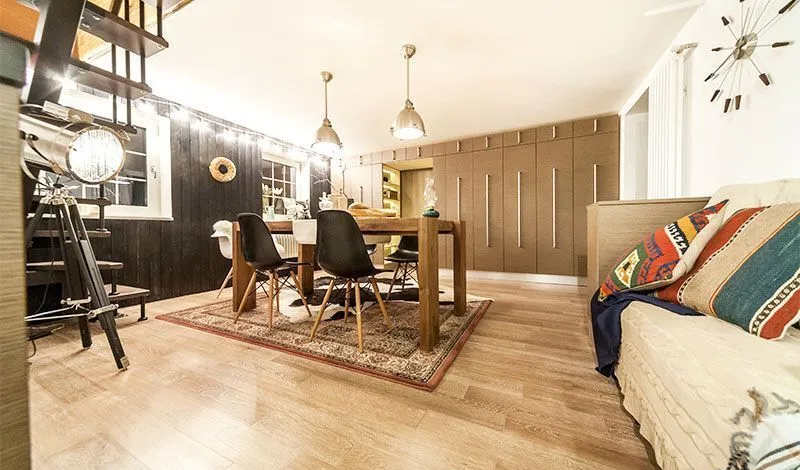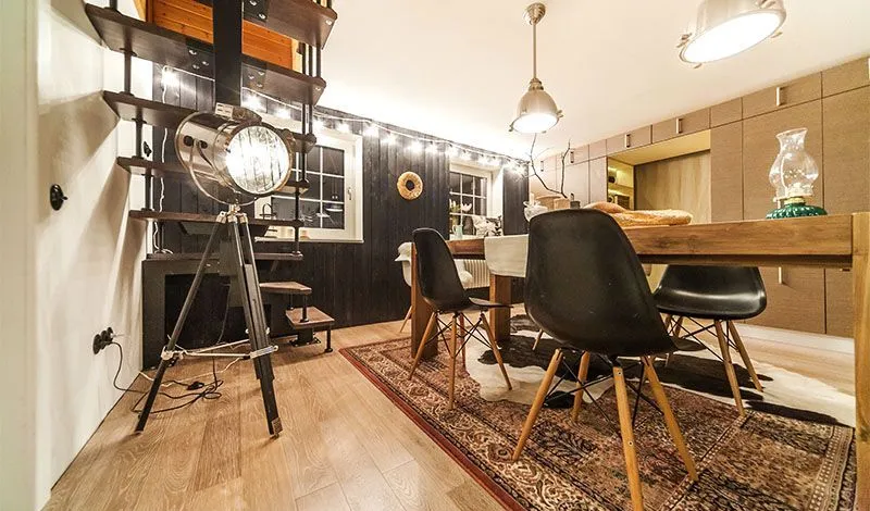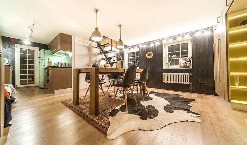 Освещение комнаты играет на нюансах. Гирлянда под старину напоминает о долгой истории дома, современные потолочные светильники подчеркивают новизну переделки, а кинематографический прожектор – будущее старшего сына наших героев, студента ВГИКа.