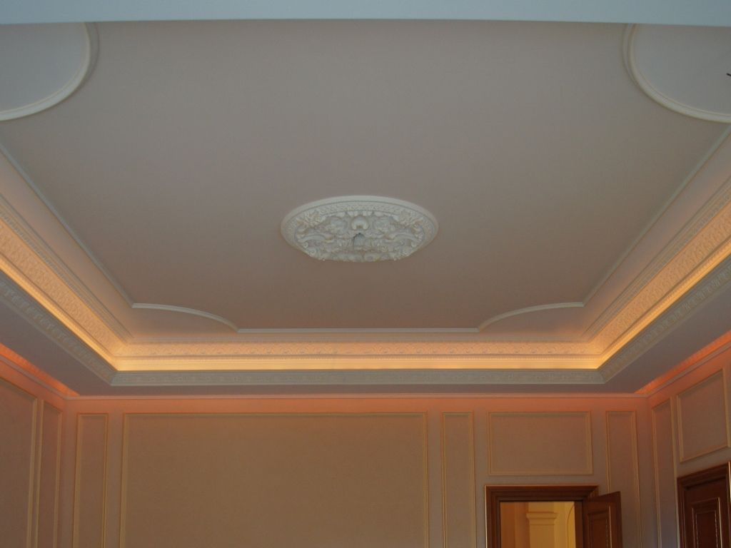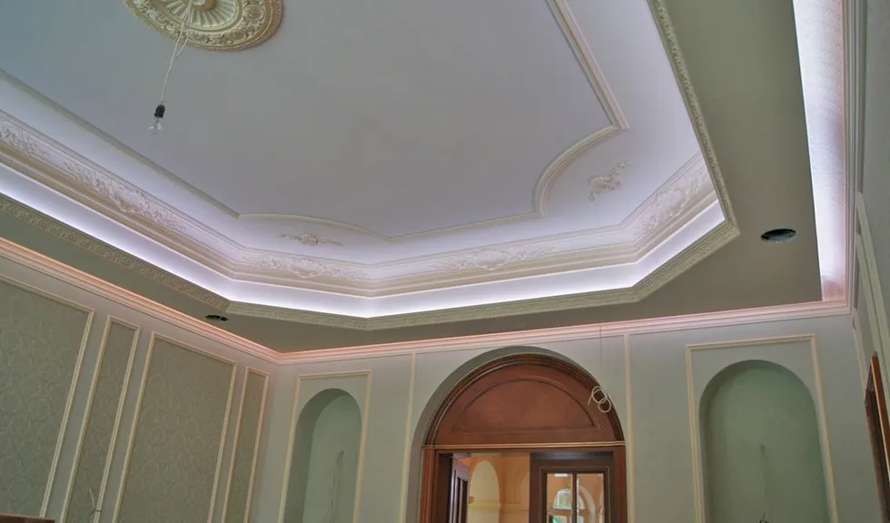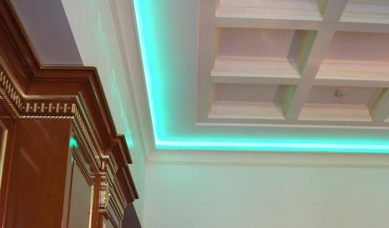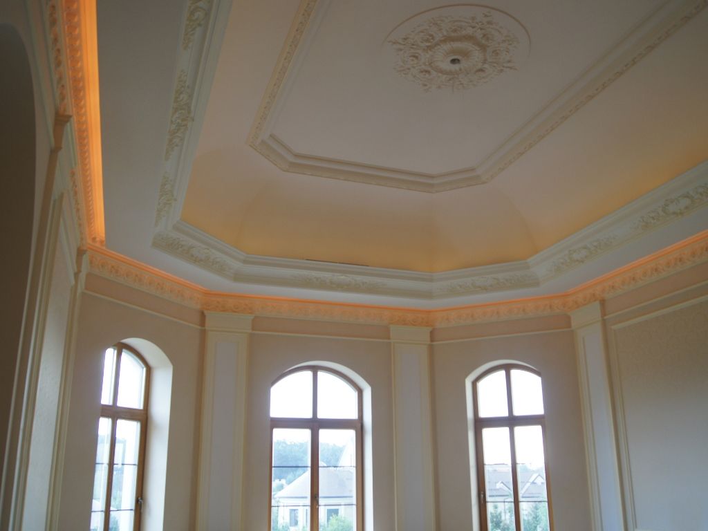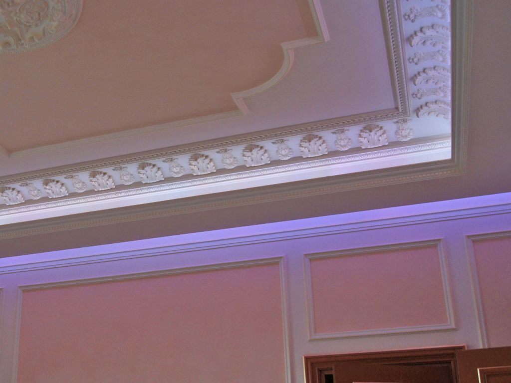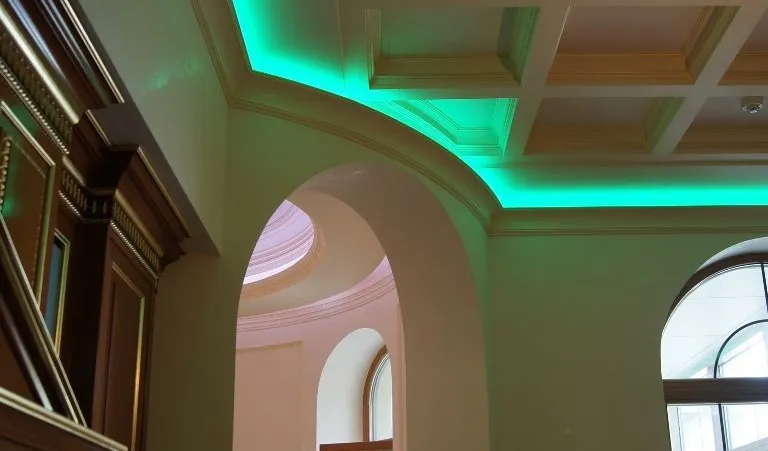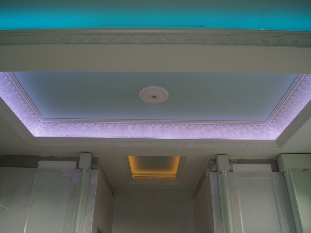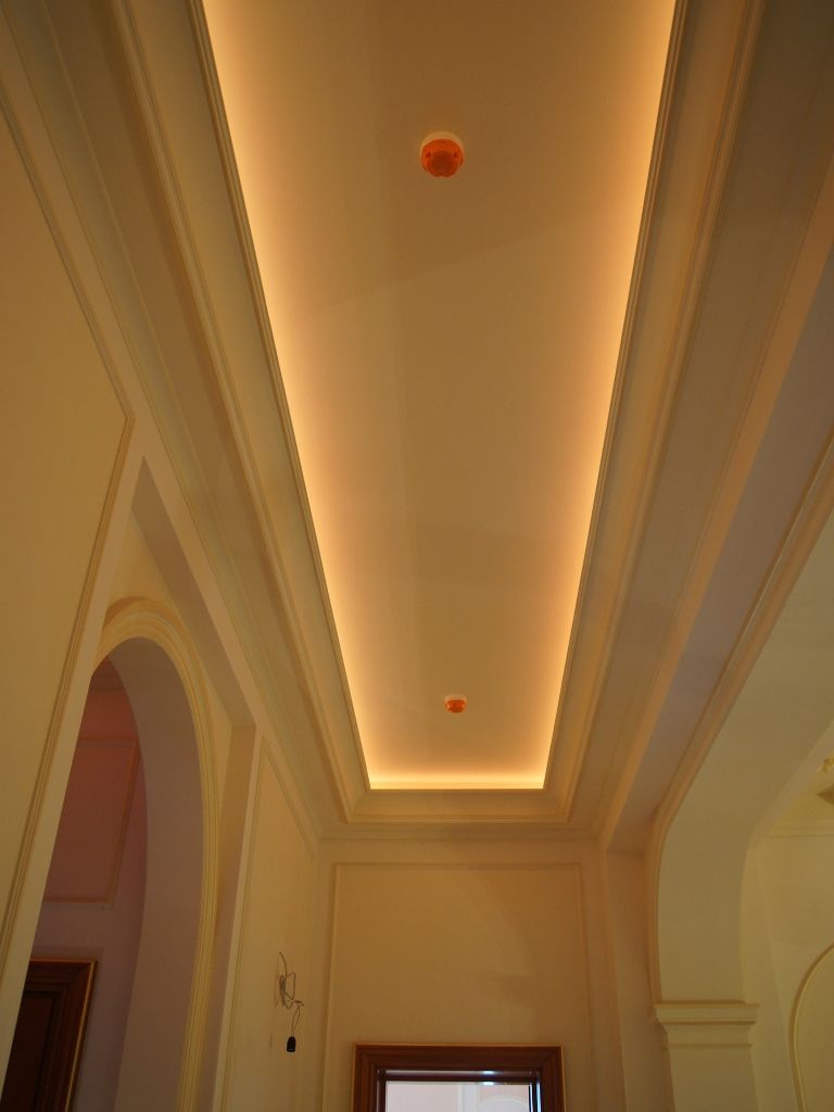 Светодиодное освещение было установлено в загородном доме, интерьер которого выполнен в классическом стиле. Декоративная контурная подсветка, установленная за полиуретановыми карнизами, придала внутренней обстановке дома сказочность и неповторимость.