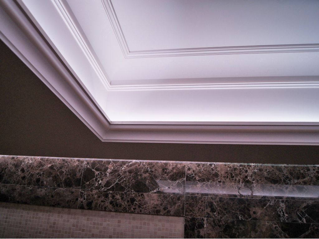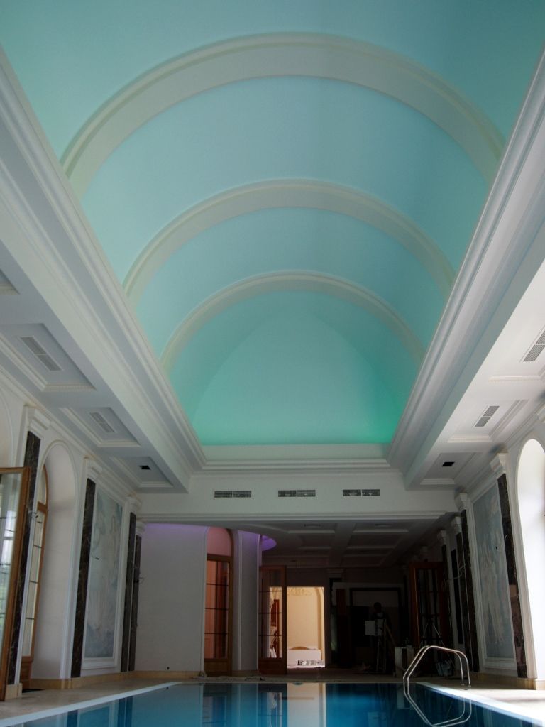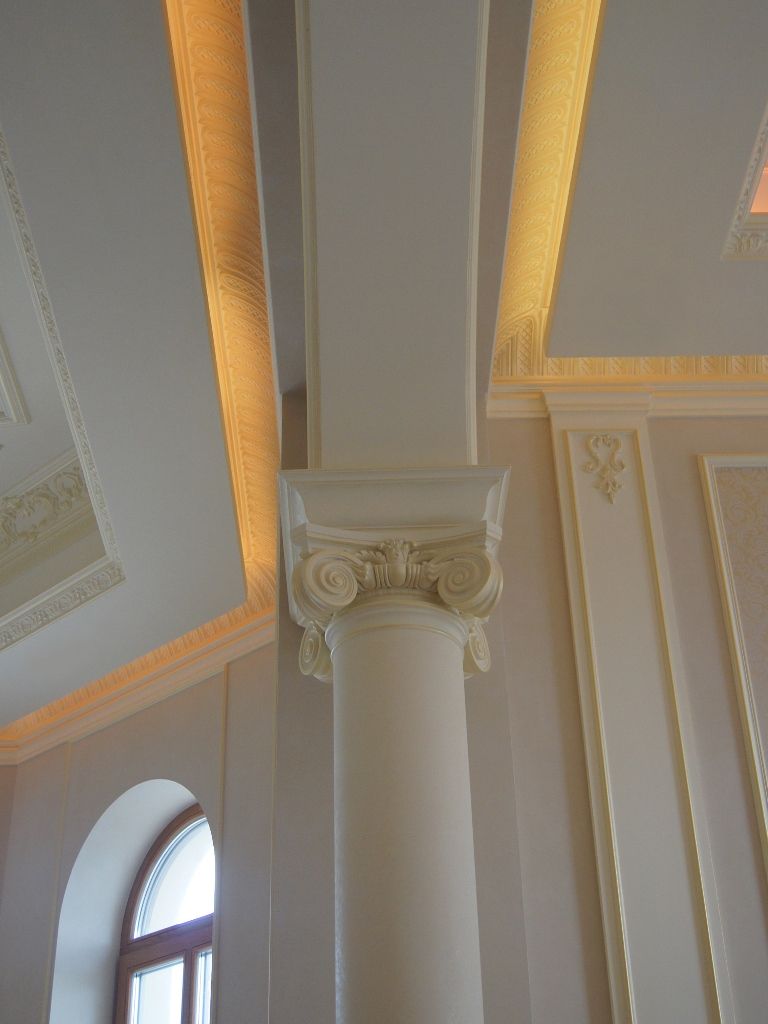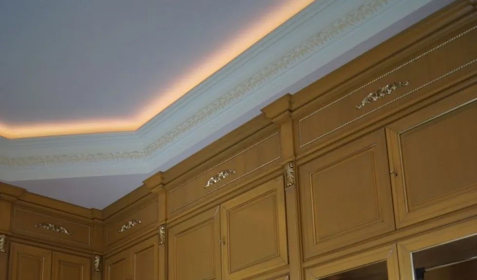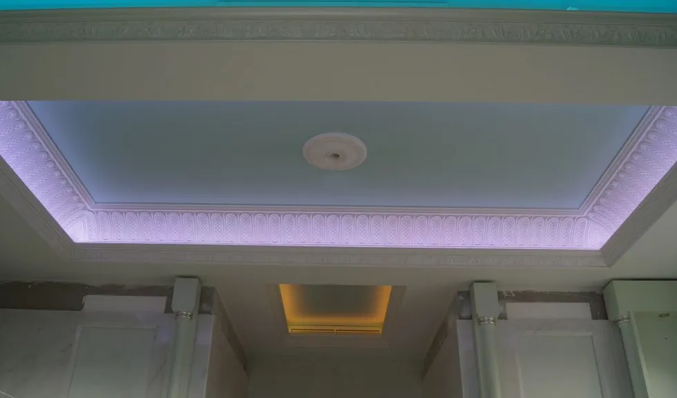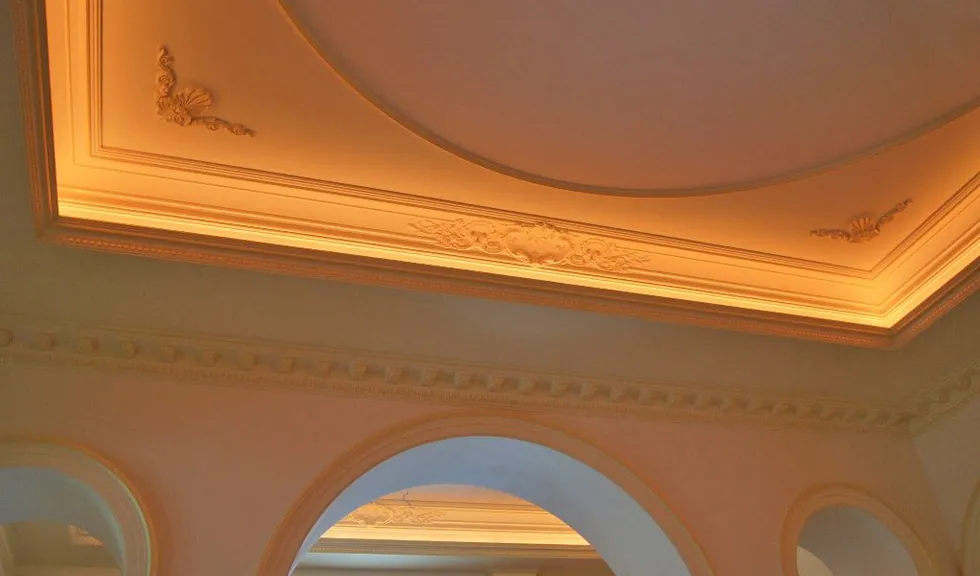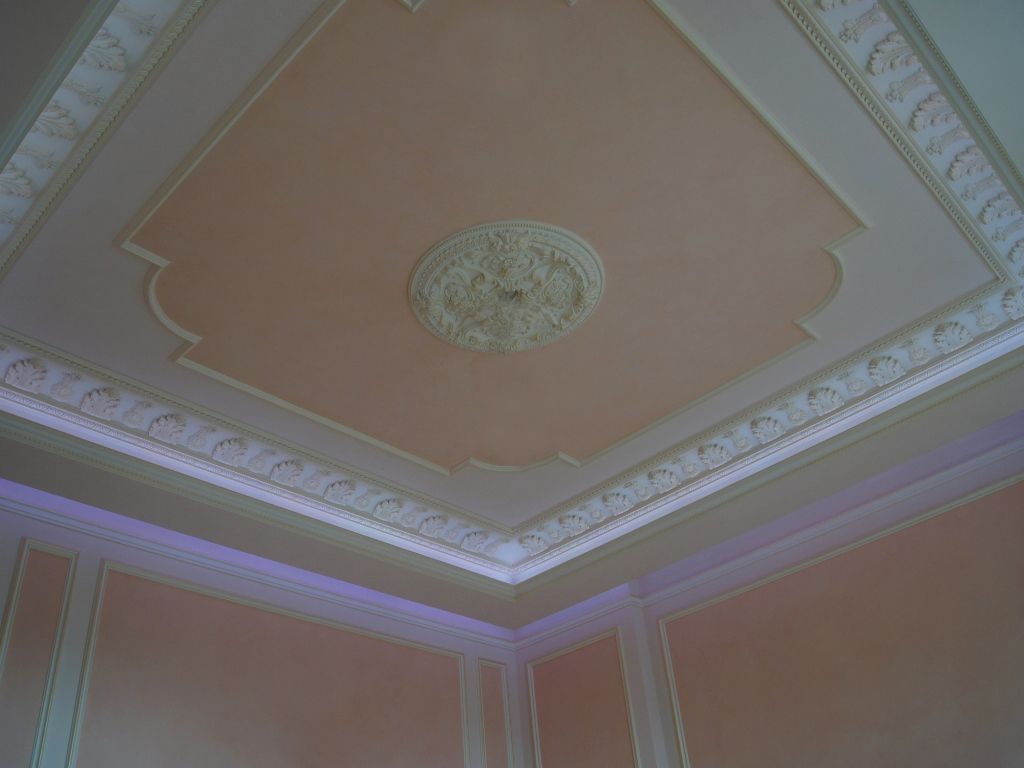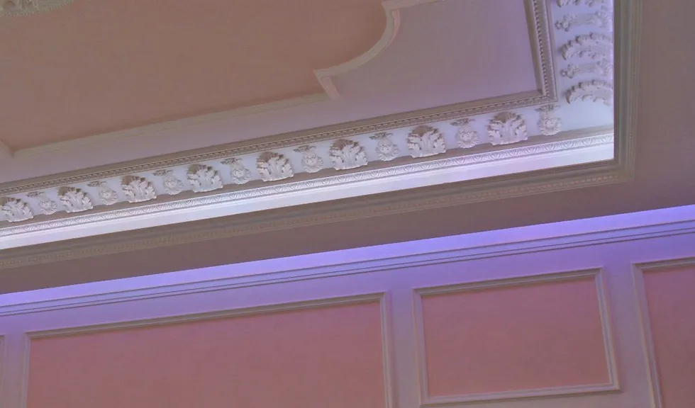 Светодиодное освещение было установлено в загородном доме, интерьер которого выполнен в классическом стиле. Декоративная контурная подсветка, установленная за полиуретановыми карнизами, придала внутренней обстановке дома сказочность и неповторимость.