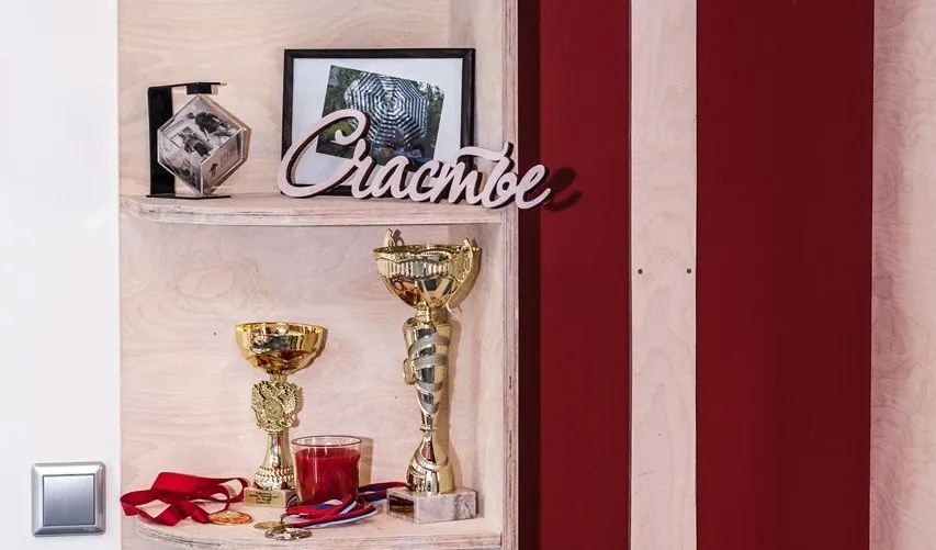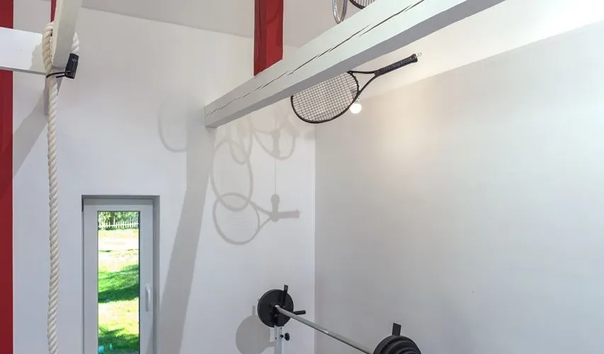 Из двух, расположенных одна над другой, комнат, дизайнеры и мастера телепроекта «Фазенда» на Первом канале сделали просторный спортивный зал. Он получился светлым не только благодаря открывшемуся пространству и большим окнам, но и множеству светодиодных светильников.