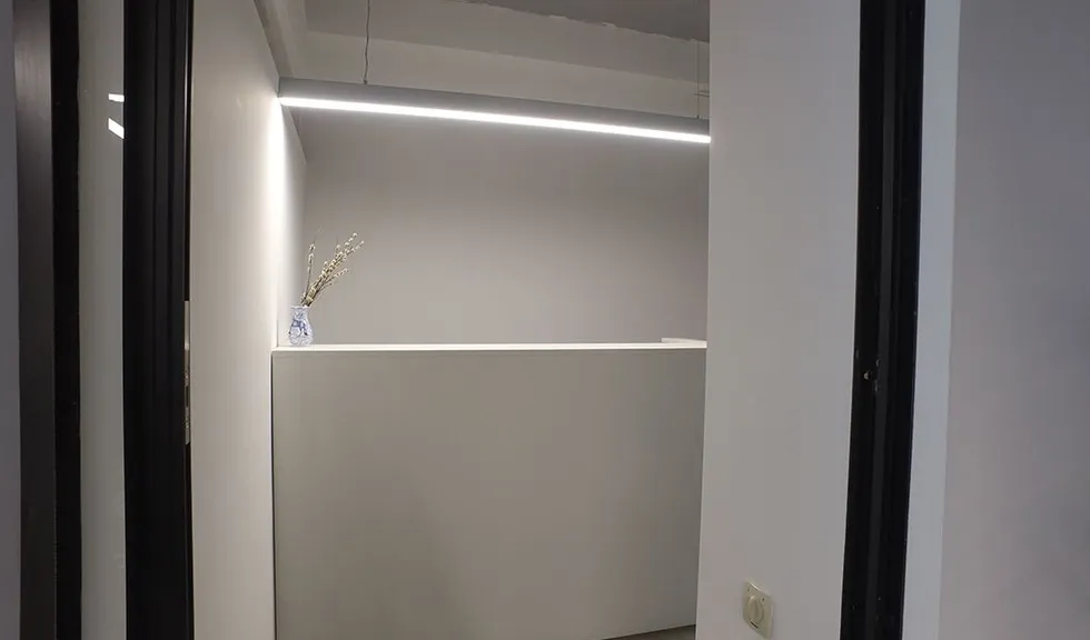 Для освещения стойки приёмной (ресепшена) использован один цельный профиль, установленный на подвесы. В конференц-зале решение более интересное: профили объединены в единую подвесную конструкцию прямоугольной формы. Для этого концы профилей были срезаны под углом 45 градусов для их плотной стыковки и скреплены между собой специальными соединителями. Светильник получился ярким и эффектным - не в последнюю очередь благодаря матовому экрану, превращающему свечение в единую линию света.