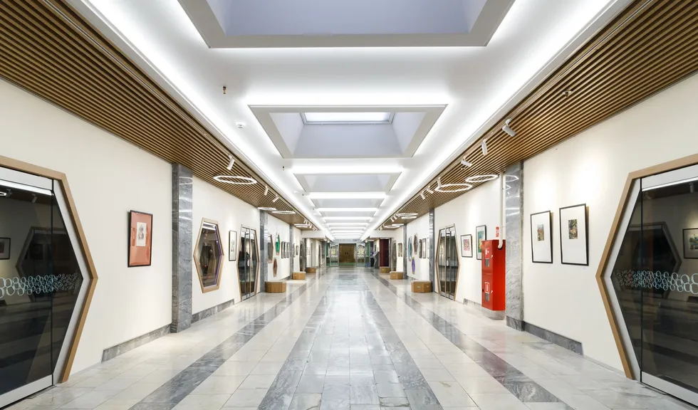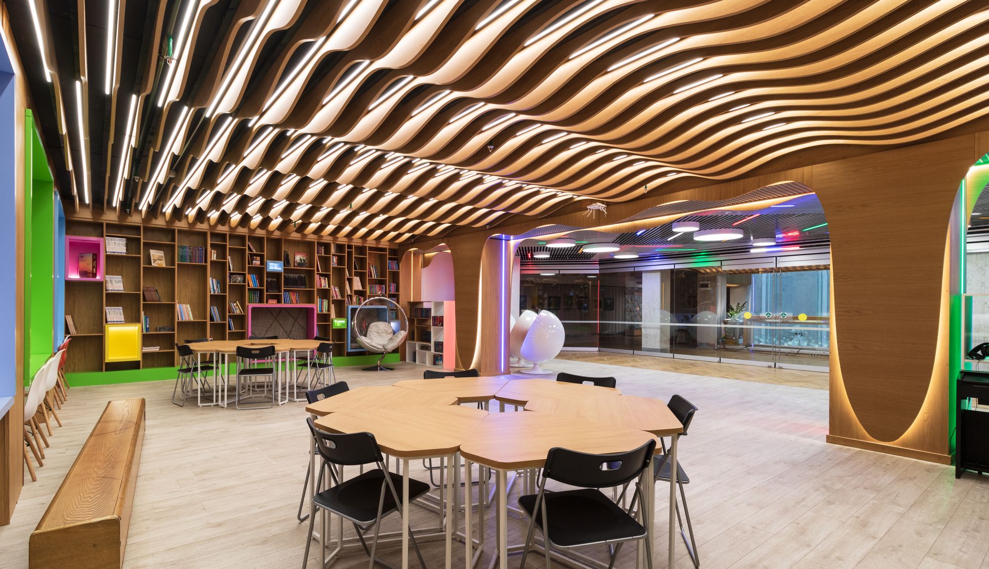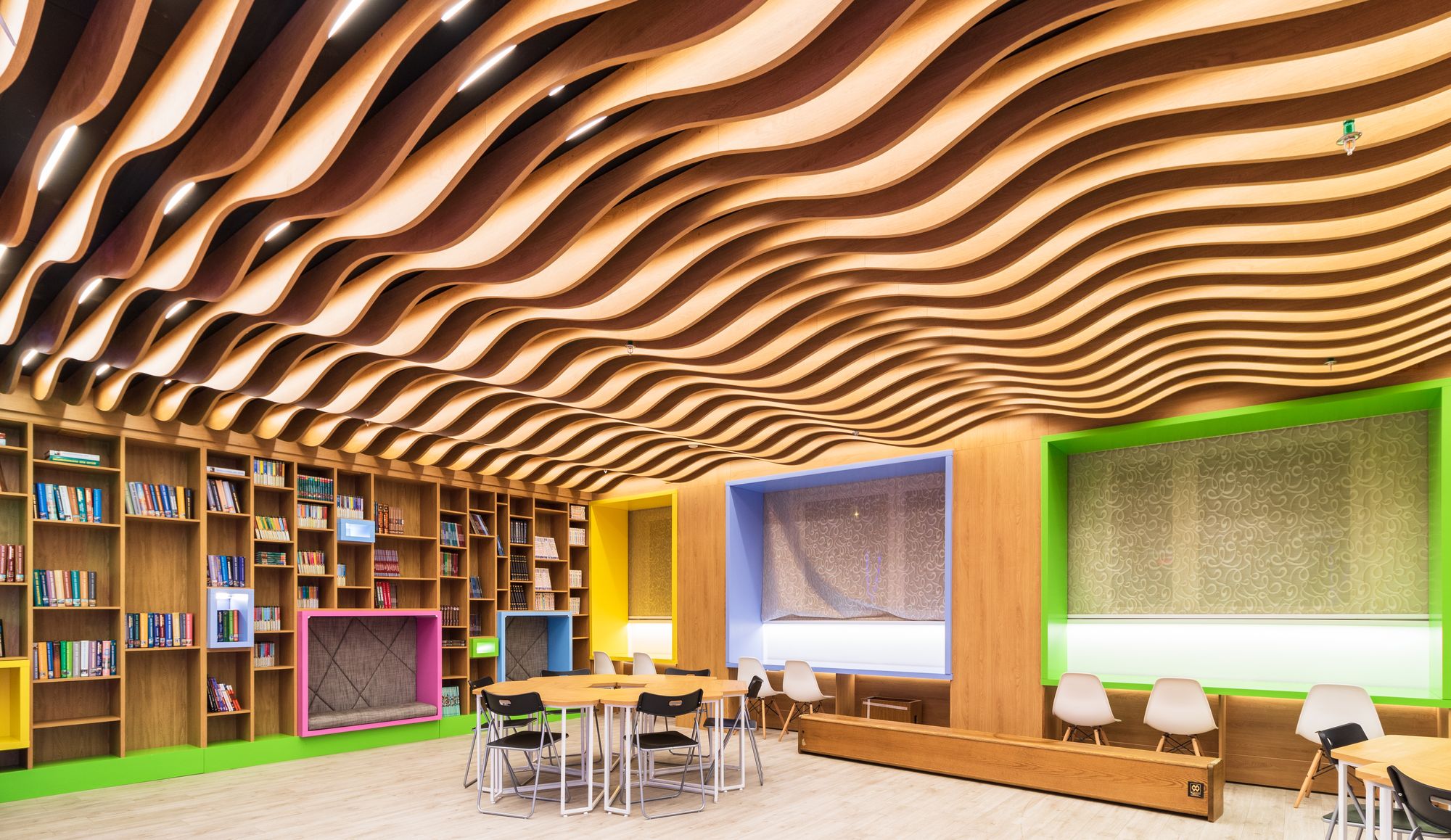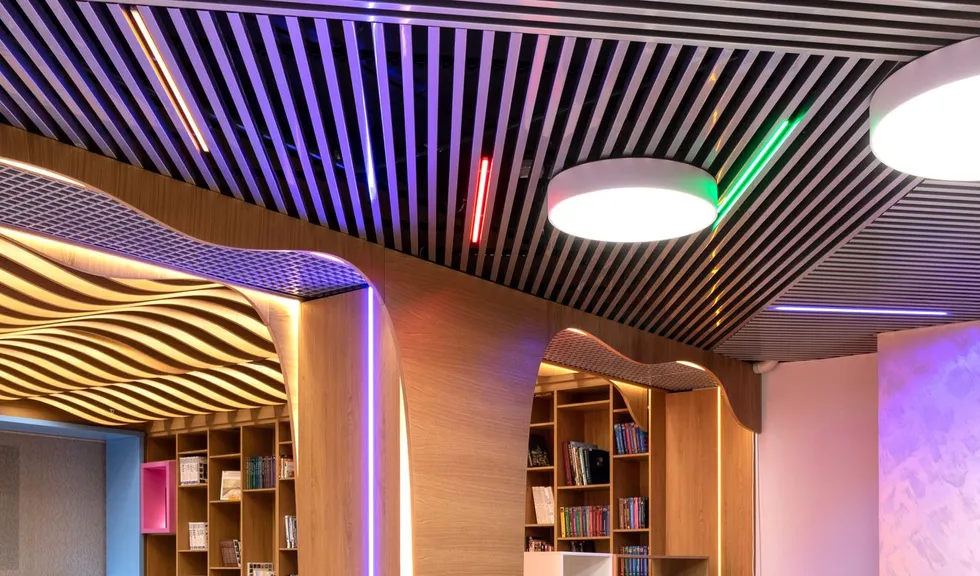 В этом красивом и масштабном проекте использовано максимальное количество светодиодной ленты различных цветов свечения. Библиотека похожа на сказочное царство света, где герои книг способны оживать в воображении читателей. При всей яркости и красочности проекта основным цветом свечения является классический белый с высоким индексом цветопередачи, который не вызывает переутомления глаз во время чтения книг. Для смены цвета свечения лент используются сенсорные пульты управления. Под потолком разместились большие квадратные светильники, напоминающие мансардные окна. Во многих залах библиотеки сделан реечный потолок с эффектом волн и встроенными световыми линиями. Интересное сочетание одноцветных и многоцветных лент, прямых световых линий и круглых потолочных светильников создает в помещении удивительную атмосферу.
