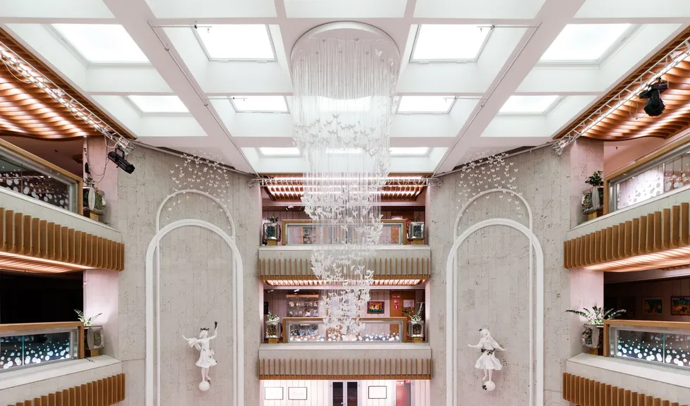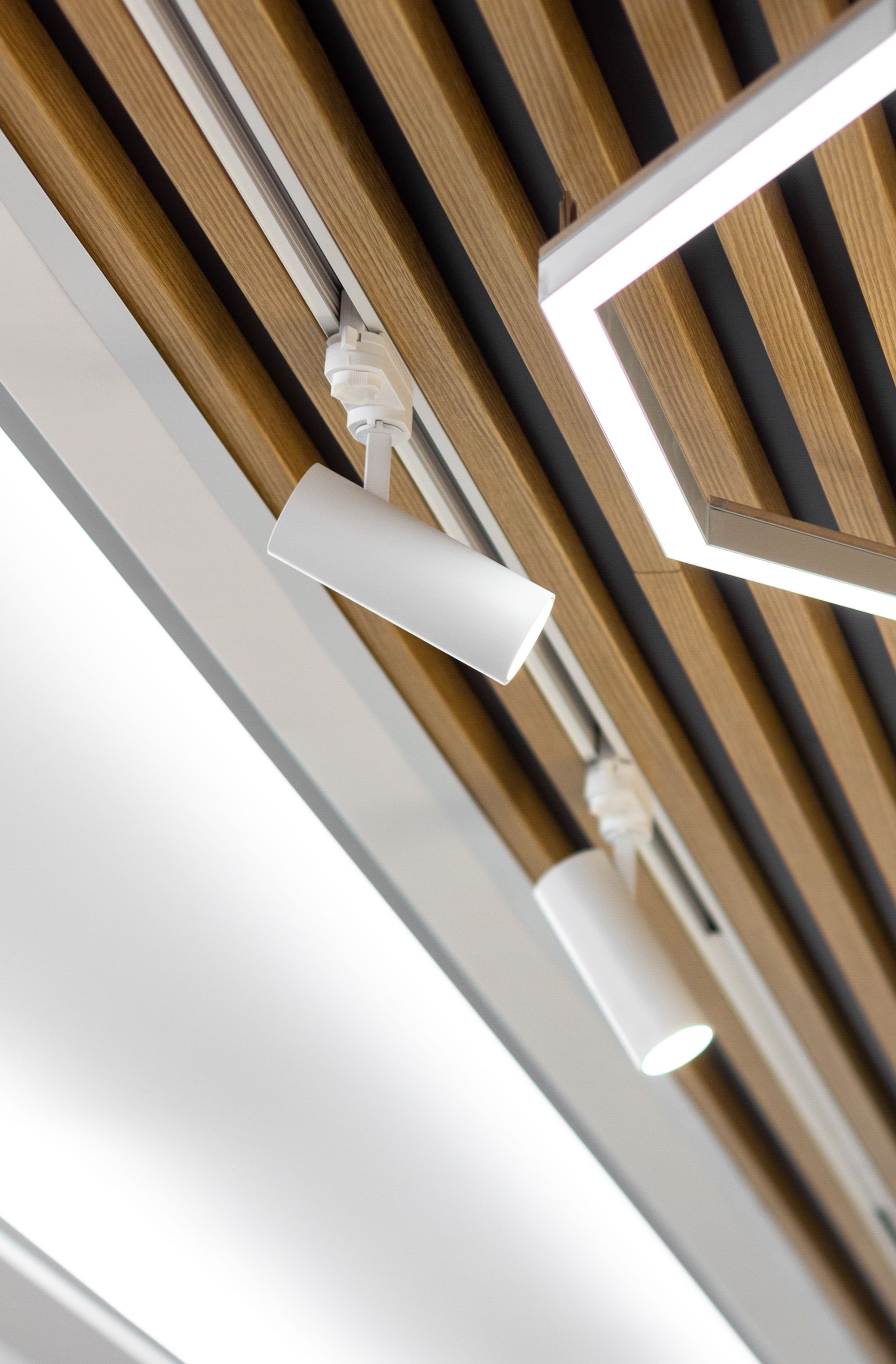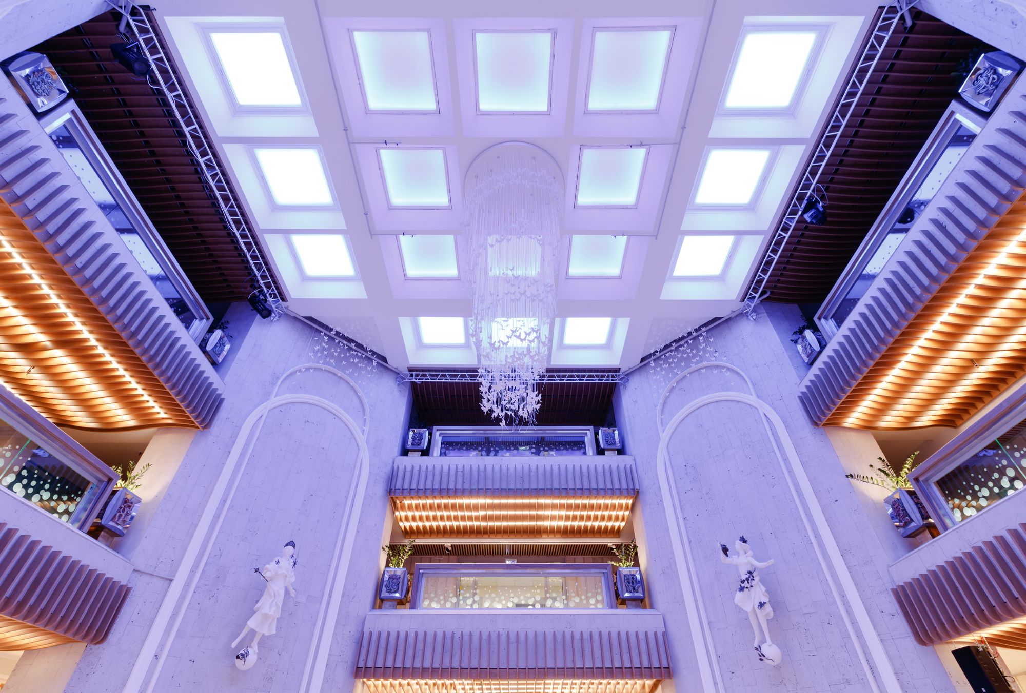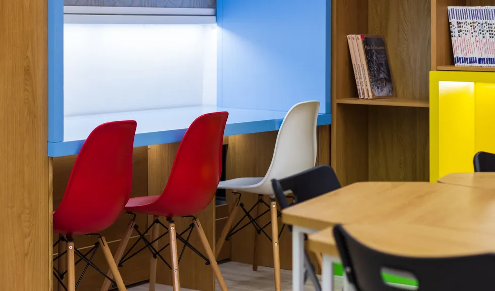 В этом красивом и масштабном проекте использовано максимальное количество светодиодной ленты различных цветов свечения. Библиотека похожа на сказочное царство света, где герои книг способны оживать в воображении читателей. При всей яркости и красочности проекта основным цветом свечения является классический белый с высоким индексом цветопередачи, который не вызывает переутомления глаз во время чтения книг. Для смены цвета свечения лент используются сенсорные пульты управления. Под потолком разместились большие квадратные светильники, напоминающие мансардные окна. Во многих залах библиотеки сделан реечный потолок с эффектом волн и встроенными световыми линиями. Интересное сочетание одноцветных и многоцветных лент, прямых световых линий и круглых потолочных светильников создает в помещении удивительную атмосферу.