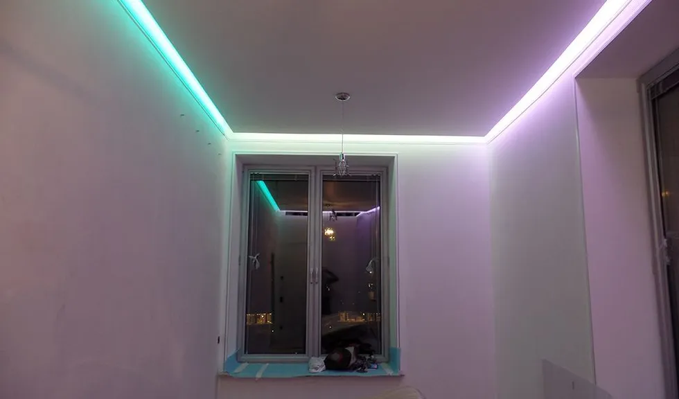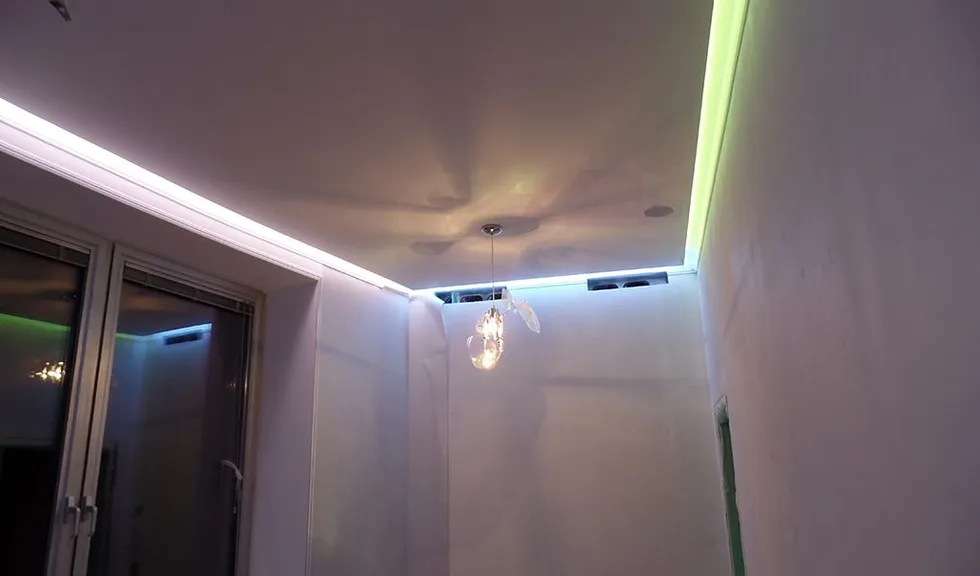 Весьма оригинальный проект светодиодной подсветки был реализован в данной квартире: она не просто многоцветная, а к тому же реагирующая на звуки музыки.