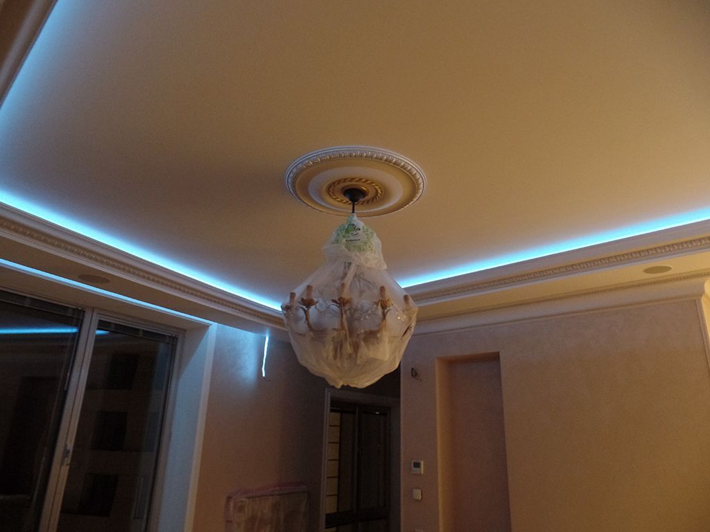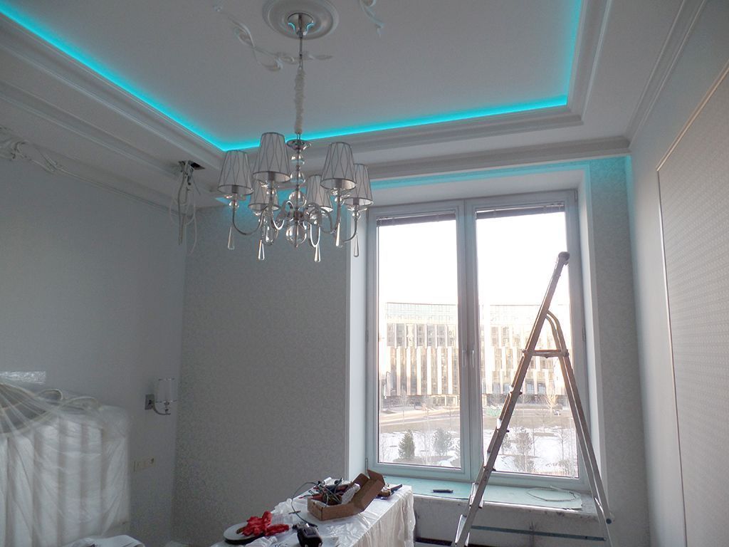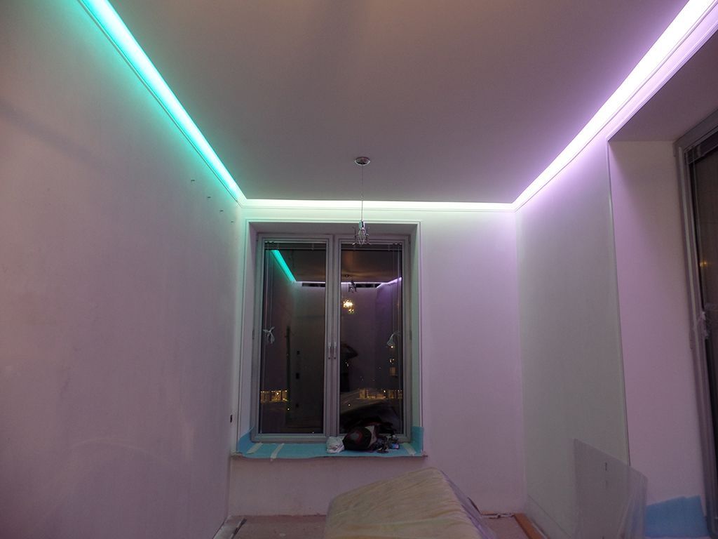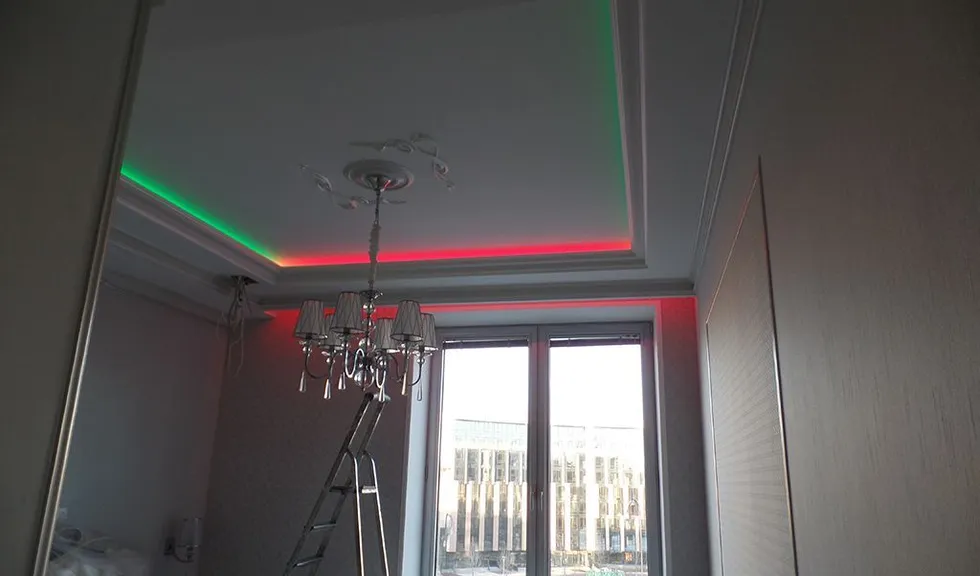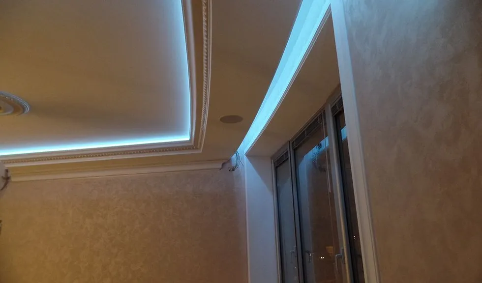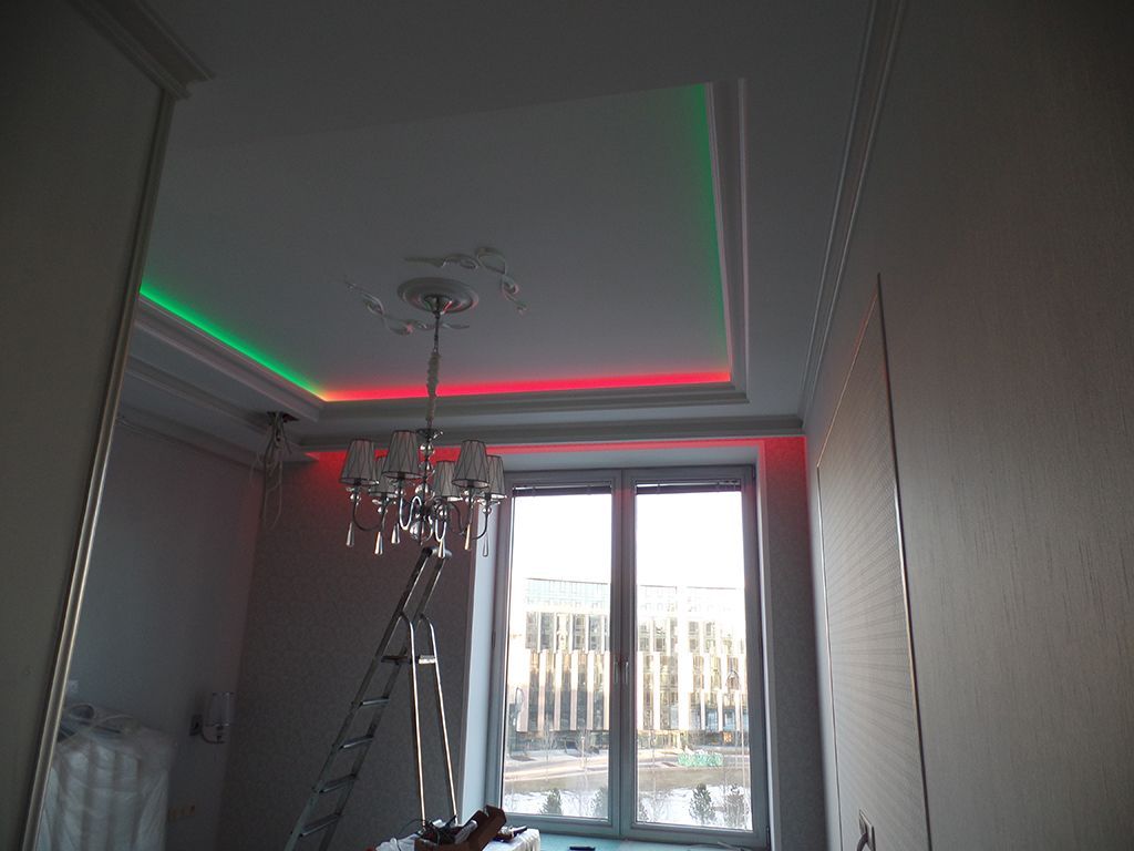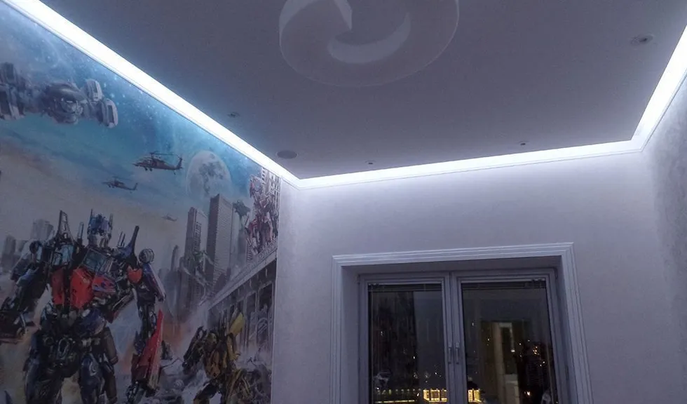 Во всех комнатах квартиры была установлена динамическая светомузыкальная подсветка, она работает в соответствии воспроизводимой музыкой. Для этого была использована многоцветная RGB светодиодная лента arlight®, управляемая музыкальным RGB контроллером arlight®. Светодиодную ленту установили в ниши потолка по периметру комнат и подключили таким образом, чтобы каждая из сторон комнаты была отдельной зоной подсветки. Светомузыкальный RGB контроллер arlight® имеет 4 канала, отвечающих за разные диапазоны звуковых частот, и светодиодные ленты были подключены таким образом, чтобы каждая из 4 сторон комнаты подсвечивалась разными цветами, в зависимости от играющей музыки.