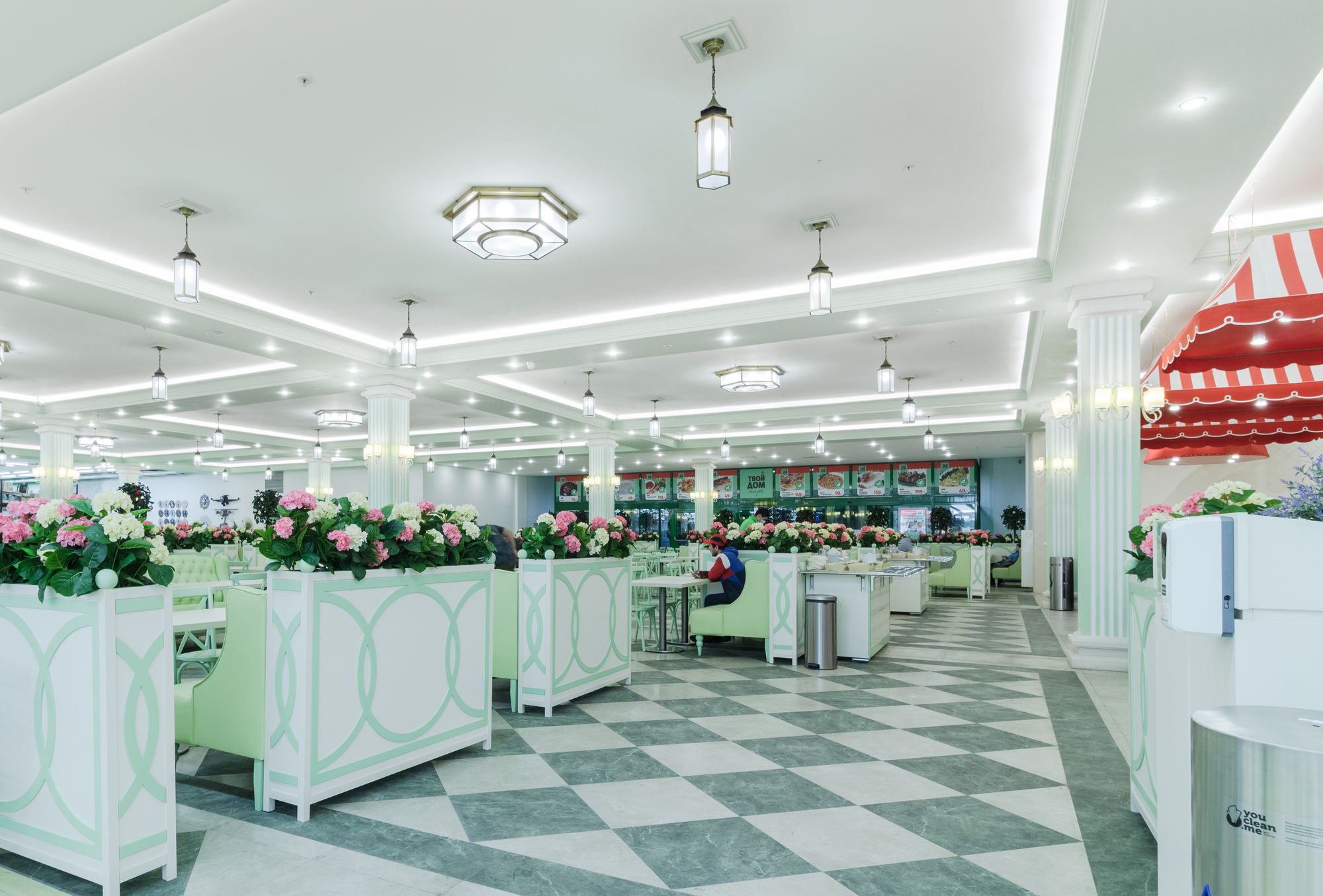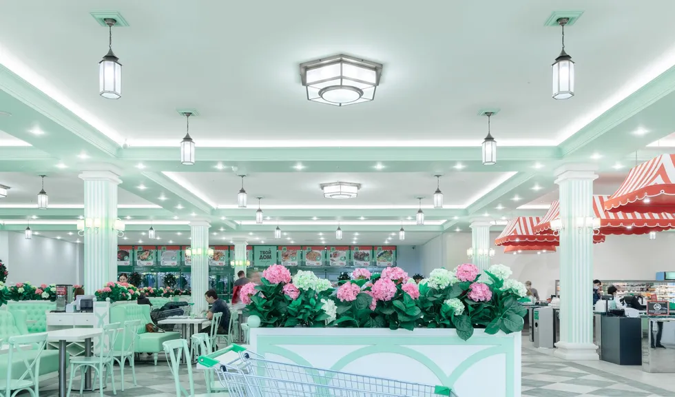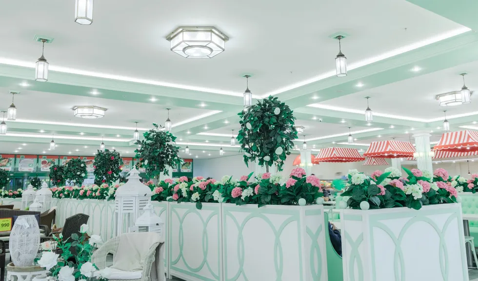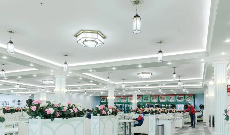 Светодиодную контурную подсветку использовали по всему периметру потолка торговой площади. Такой световой прием является универсальным решением и позволяет организовать качественное основное освещение большой площади. Дневной свет с высоким индексом цветопередачи выгодно подчеркивает все достоинства предметов интерьера, сохраняет высокую работоспособность сотрудников в течение всего дня и побуждает посетителей к покупкам.