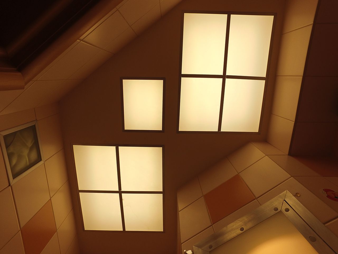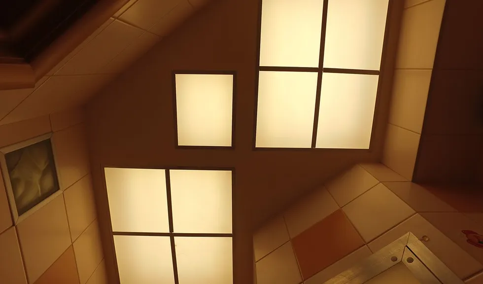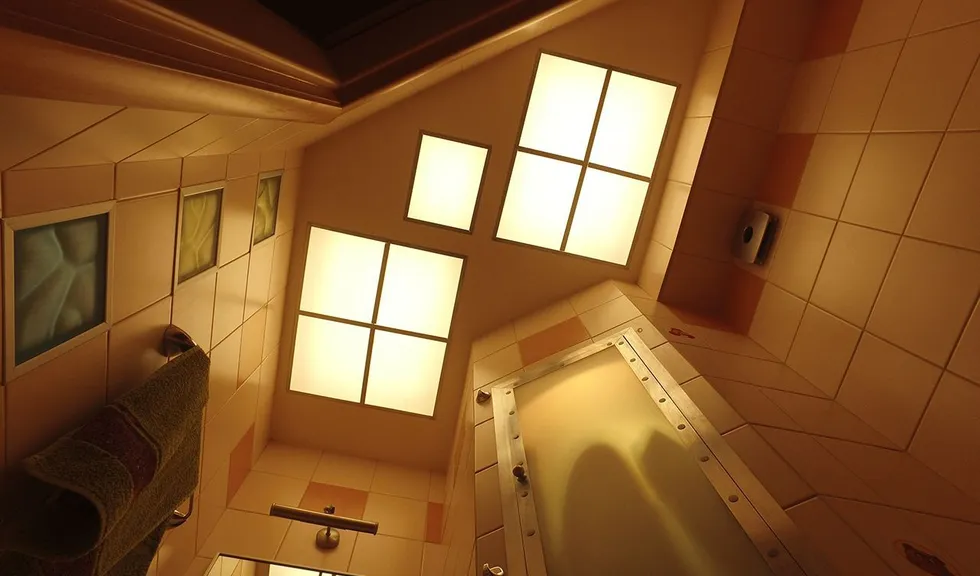 Освещение ванной реализовано при помощи квадратных светильников, встроенных в потолок. Стёкла-рассеиватели были сняты, люминесцентные лампы и проводка демонтированы. Затем специалисты рассчитали оптимальное расстояние между светодиодной лентой и стеклом, чтобы получить равномерную засветку. Ленту установили в соответствии с расчётами, закрыли рассеивателями и получили равномерно светящиеся квадраты.