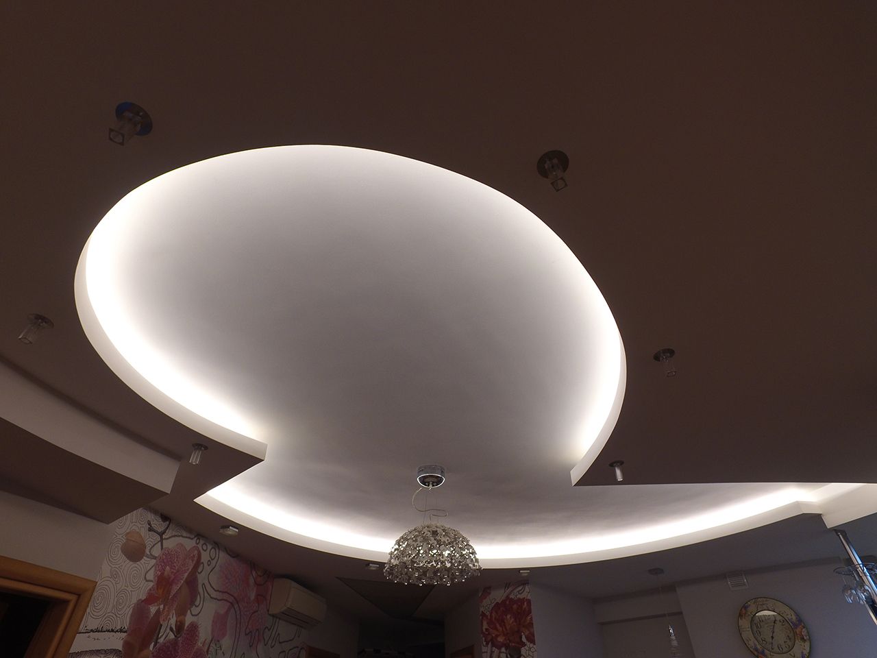 Из ниш были демонтированы люминесцентные лампы. Питающие их кабели были заменены на новые, ниши были очищены и подготовлены для установки светодиодных лент. Т.к. данная подсветка используется и в качестве основного освещения, то была выбрана мощная светодиодная лента smd 3528 240 светодиодов на метр, которую разместили по периметру потолка.