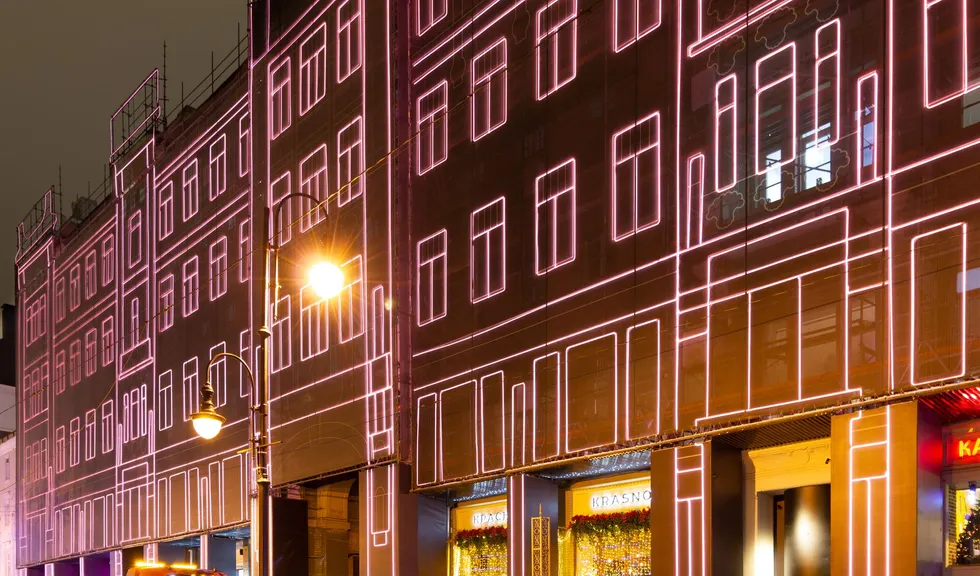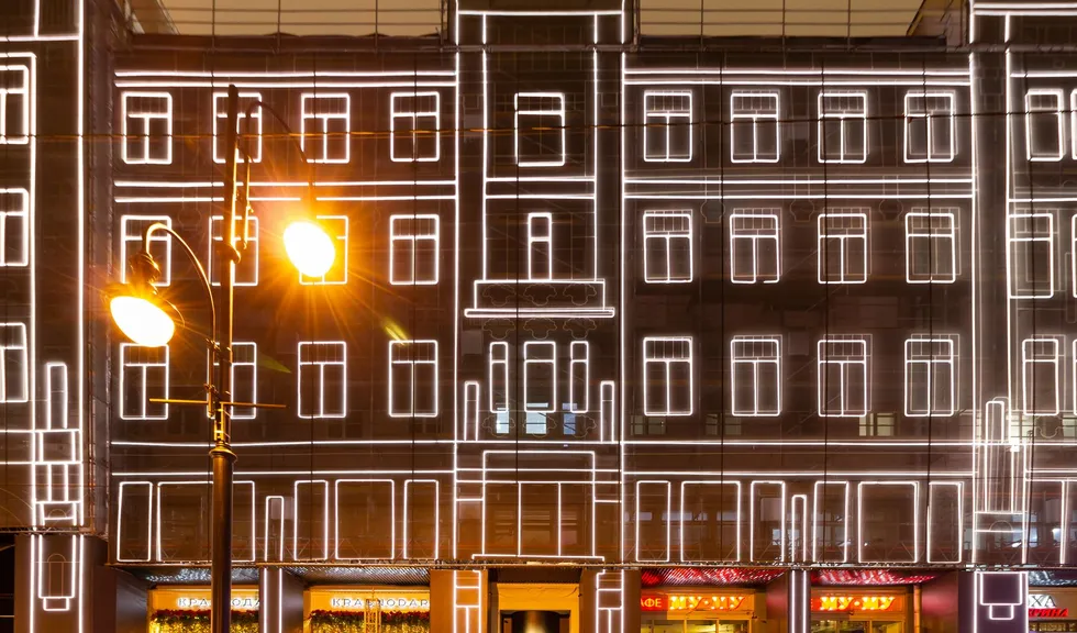 При создании эффектной фасадной подсветки премиального жилого комплекса «Большая Дмитровка IX» было использовано интересное техническое решение. Гибкий неон закреплен на внешней стороне строительной сетки, что позволило проводить отделочные работы и в то же время сделать законченную декоративную подсветку. Возможность изменения цвета RGB-неона с помощью контроллера дает возможность менять световой облик здания. За счет высокой степени пылевлагозащиты IP65 гибкий неон можно эксплуатировать при любых погодных условиях."