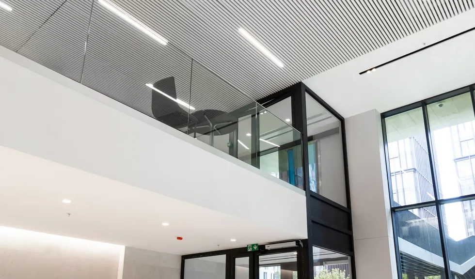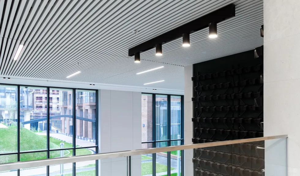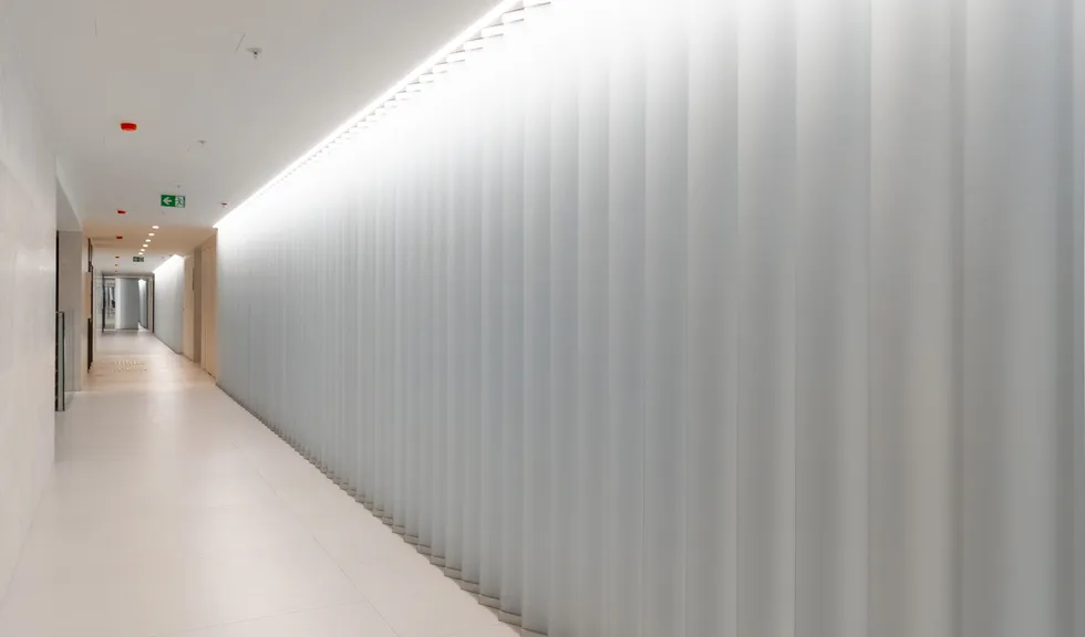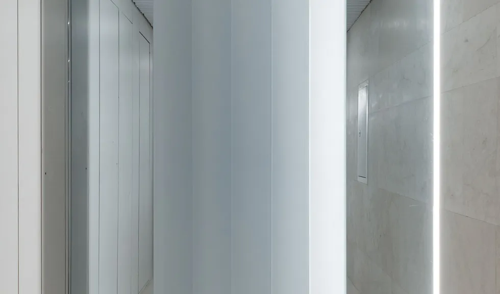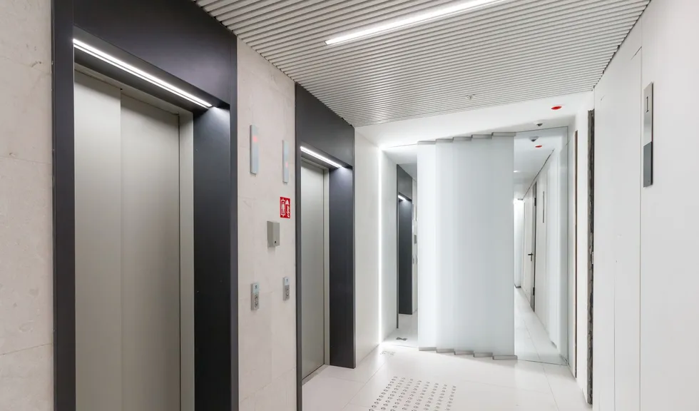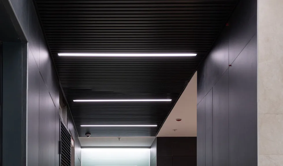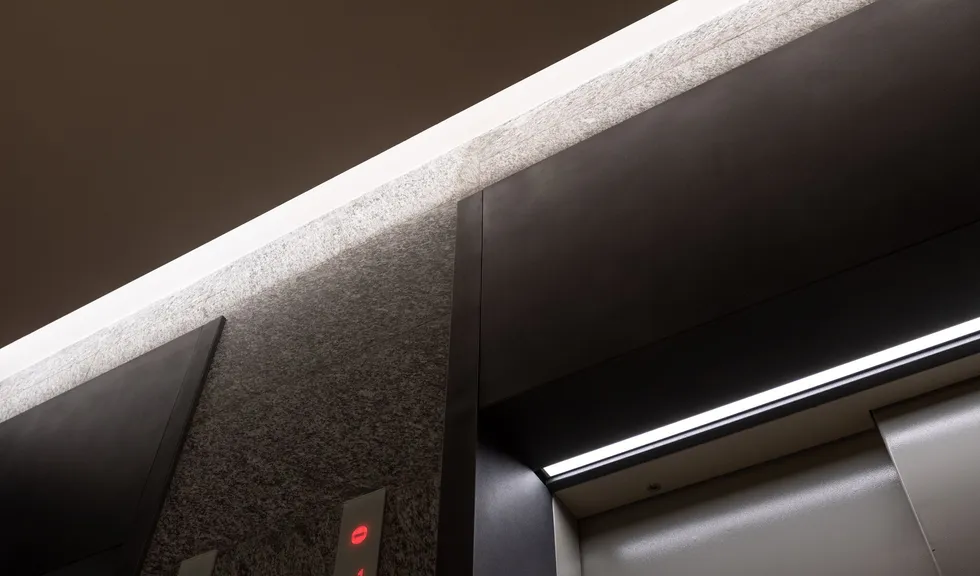 Простые и эстетичные линейные светильники идеально смотрятся в коридорных и лифтовых зонах с лаконичным дизайном. Использование линейных светильников разных размеров подчеркивает индивидуальность пространства и создает качественное освещение. Черные подвесные светильники добавляют светлым стенам и потолку контраста. Анодированные профили со светодиодными лентами интегрированы в стены и похожи на естественное солнечное освещение, проникающее внутрь здания через приоткрытую дверь. Ленты дневного и теплого белого свечения создают атмосферу солнечного дня внутри жилого комплекса в любое время суток. Светодиодные ленты и светильники применяются для основного и декоративного освещения во всех общественных зонах здания.