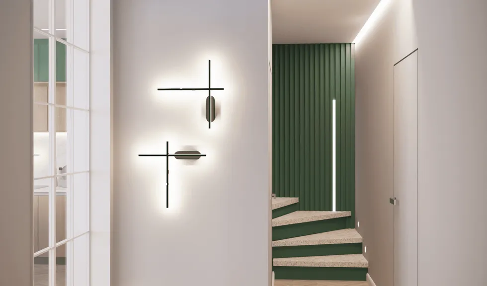 В проекте применялись анодированные профили с экраном и светодиодные ленты дневного белого свечения. Тонкие световые линии гармонично интегрированы в различные помещения. Другая часть основного освещения создана с помощью больших потолочных светильников, которые выразительно контрастируют с простыми линейными светильниками.